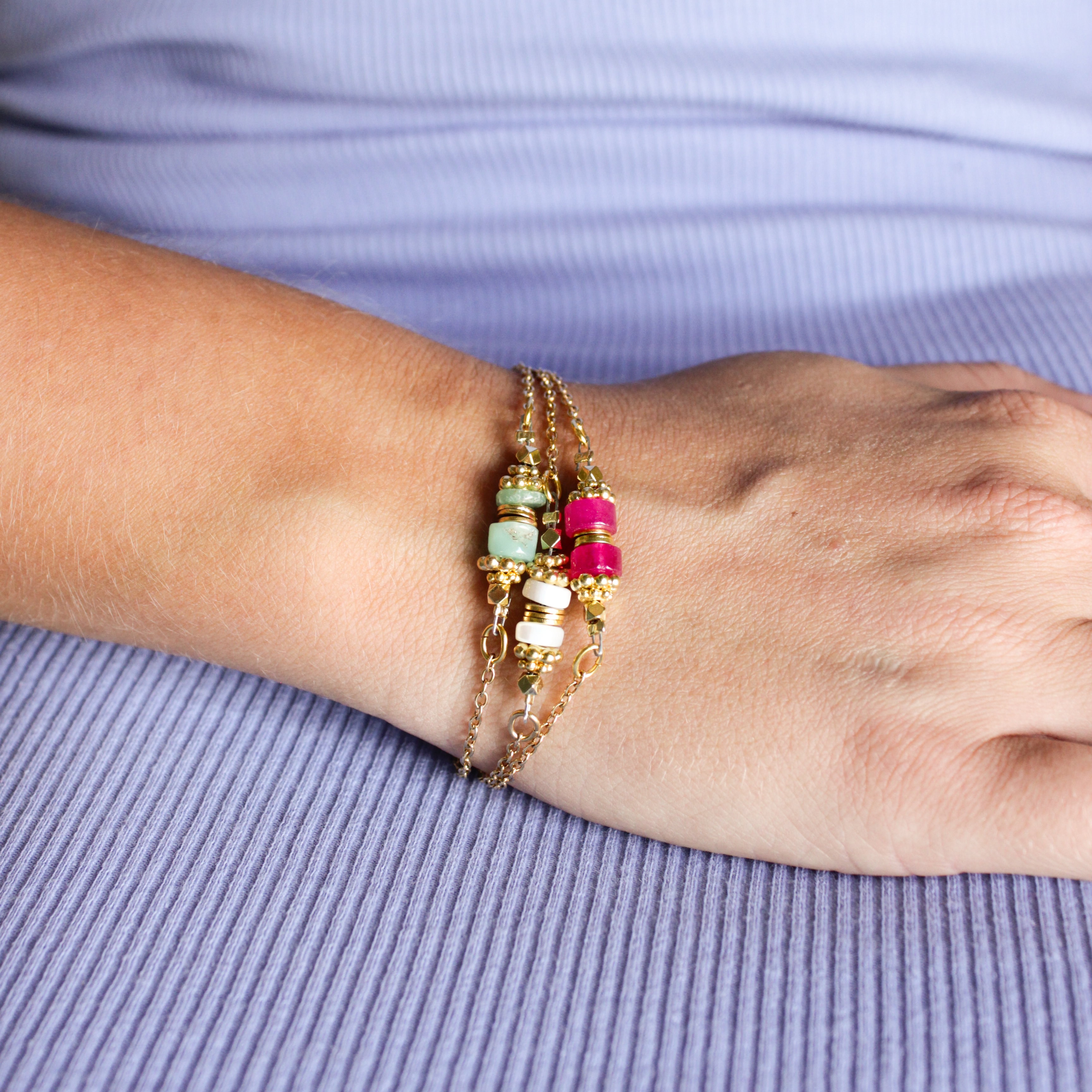 Ces bracelets associent perles heishi et pierres fines, disponibles en Nacre, Calcédoine rose et Chrysoprase. Leur design délicat apporte élégance et légèreté à votre poignet. Parfaits à porter seuls ou en accumulation pour un style bohème chic et raffiné.