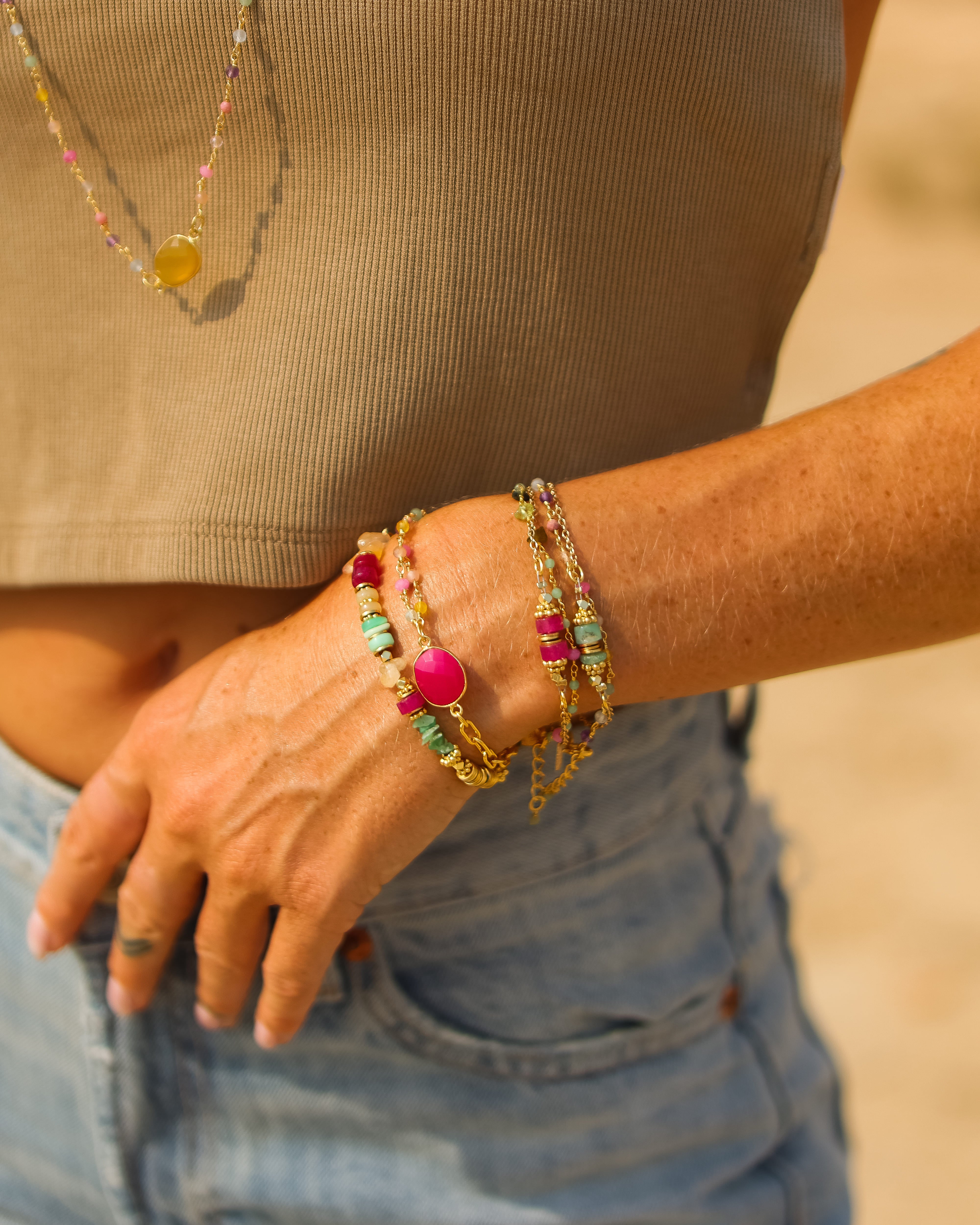 Laissez-vous envoûter par le charme dynamique du bracelet crunchs heishi ! Ce bijou pétillant, composé de Chrysoprase, Calcédoine rose et Calcédoine jaune, est l’accessoire idéal pour apporter une touche de couleur et de joie à votre poignet.