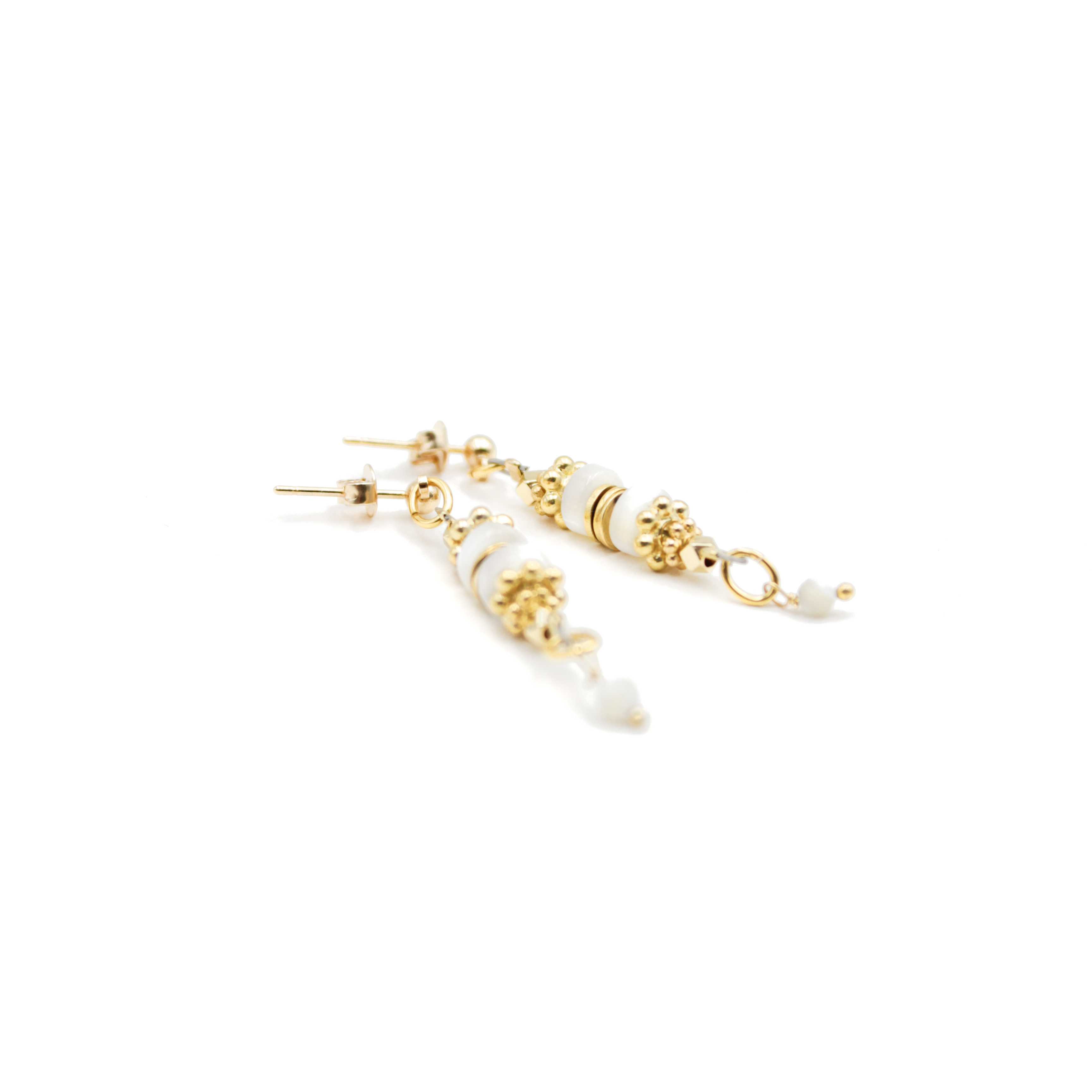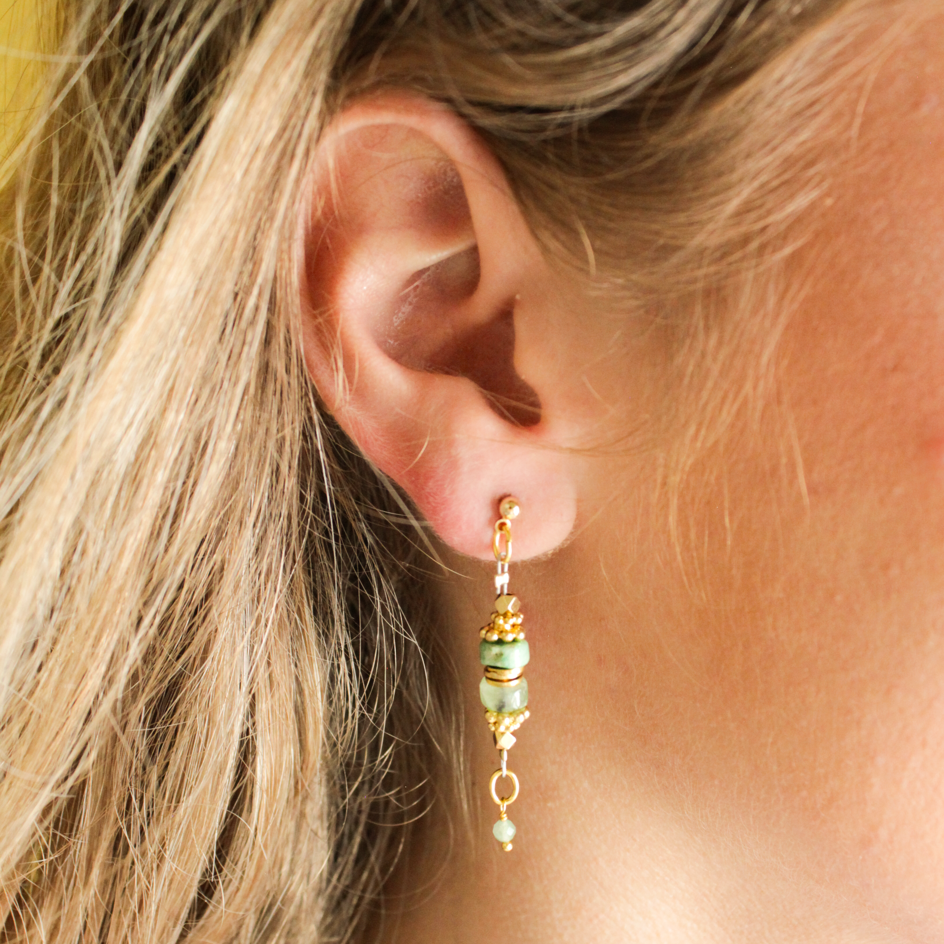 Ces boucles d’oreilles délicates associent perles heishi et pierres fines, déclinées en Nacre, Calcédoine rose et Chrysoprase. Leur design élégant apporte une touche de légèreté et de raffinement à vos tenues. Idéales pour un look bohème chic au quotidien ou en soirée.