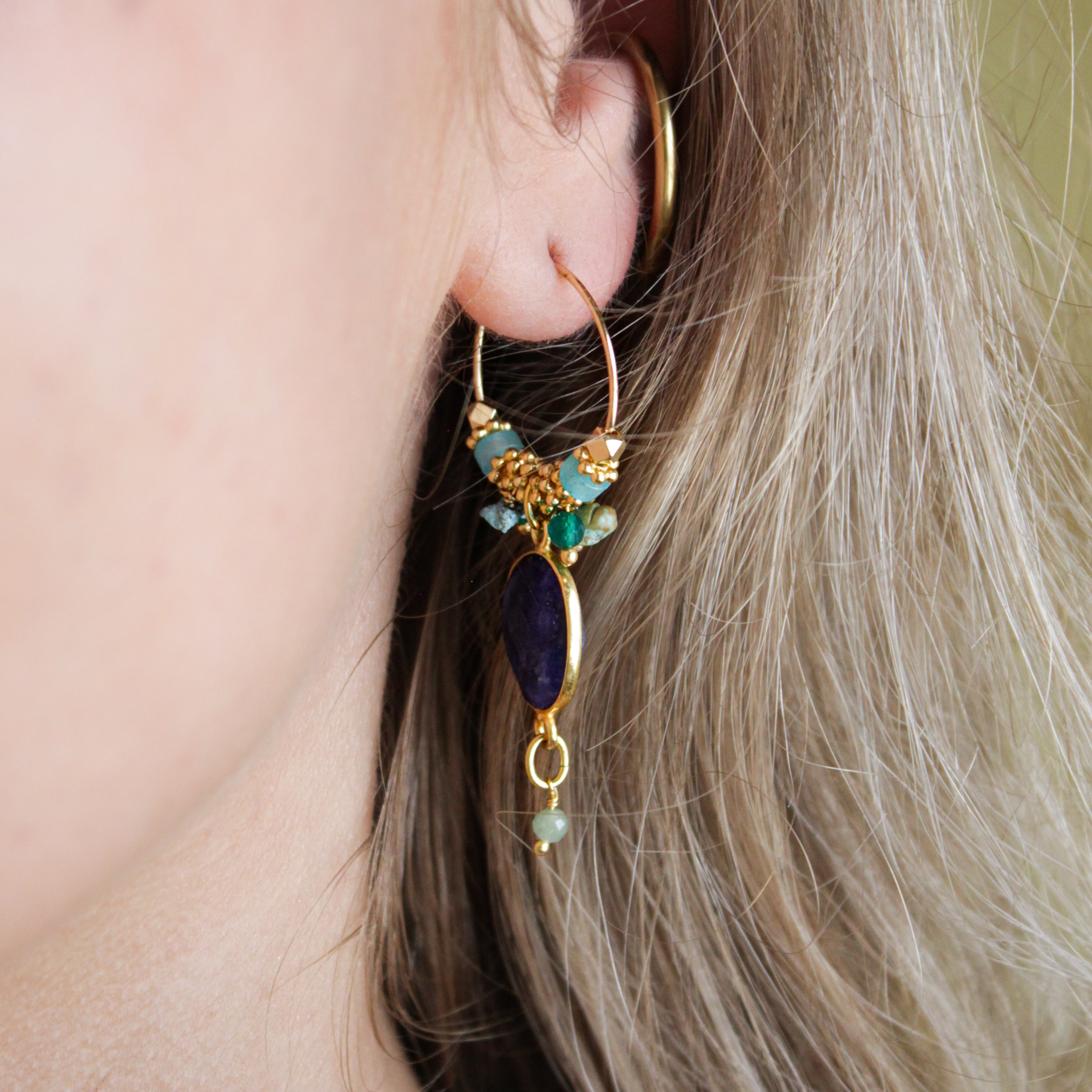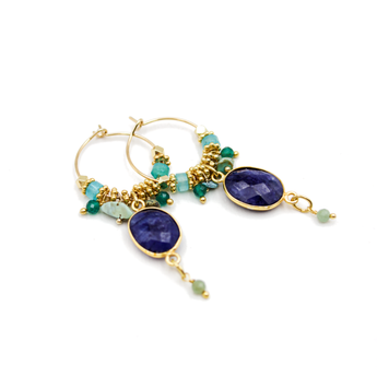 Ces créoles sont ornées de Lapis lazuli, Chrysocolle, Chrysoprase et Jade, pour un mélange harmonieux de nuances bleues et vertes. Leur design élégant et lumineux sublime vos tenues avec raffinement. Un bijou polyvalent, idéal au quotidien comme pour les occasions spéciales.