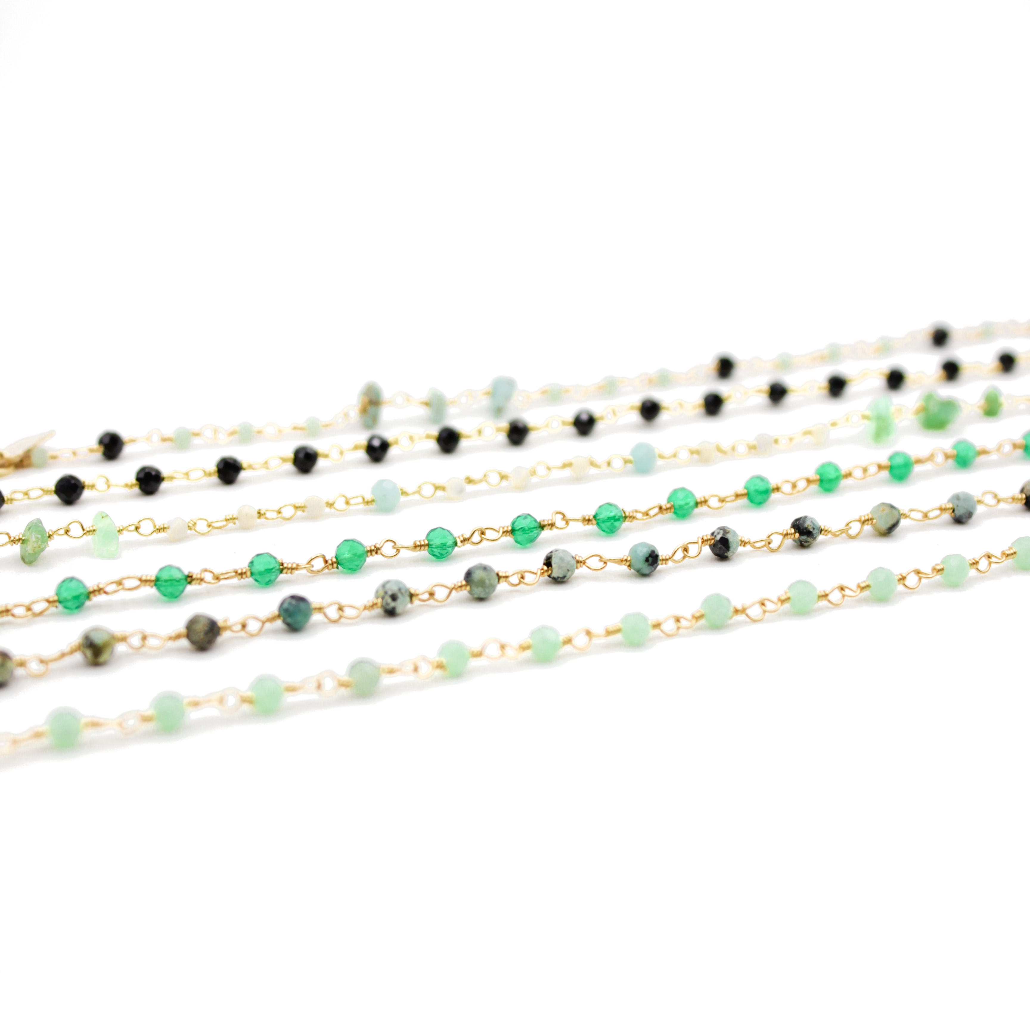 - Pierres fines : Nacre, Tourmaline, Onyx noir, Onyx vert, Jaspe aquaterra, Améthyste, Chakra pastel, Calcédoine rose, Chrysoprase/Calcédoine rose, Chrysoprase, Turquoise/Onyx noir, Nacre/Chrysoprase