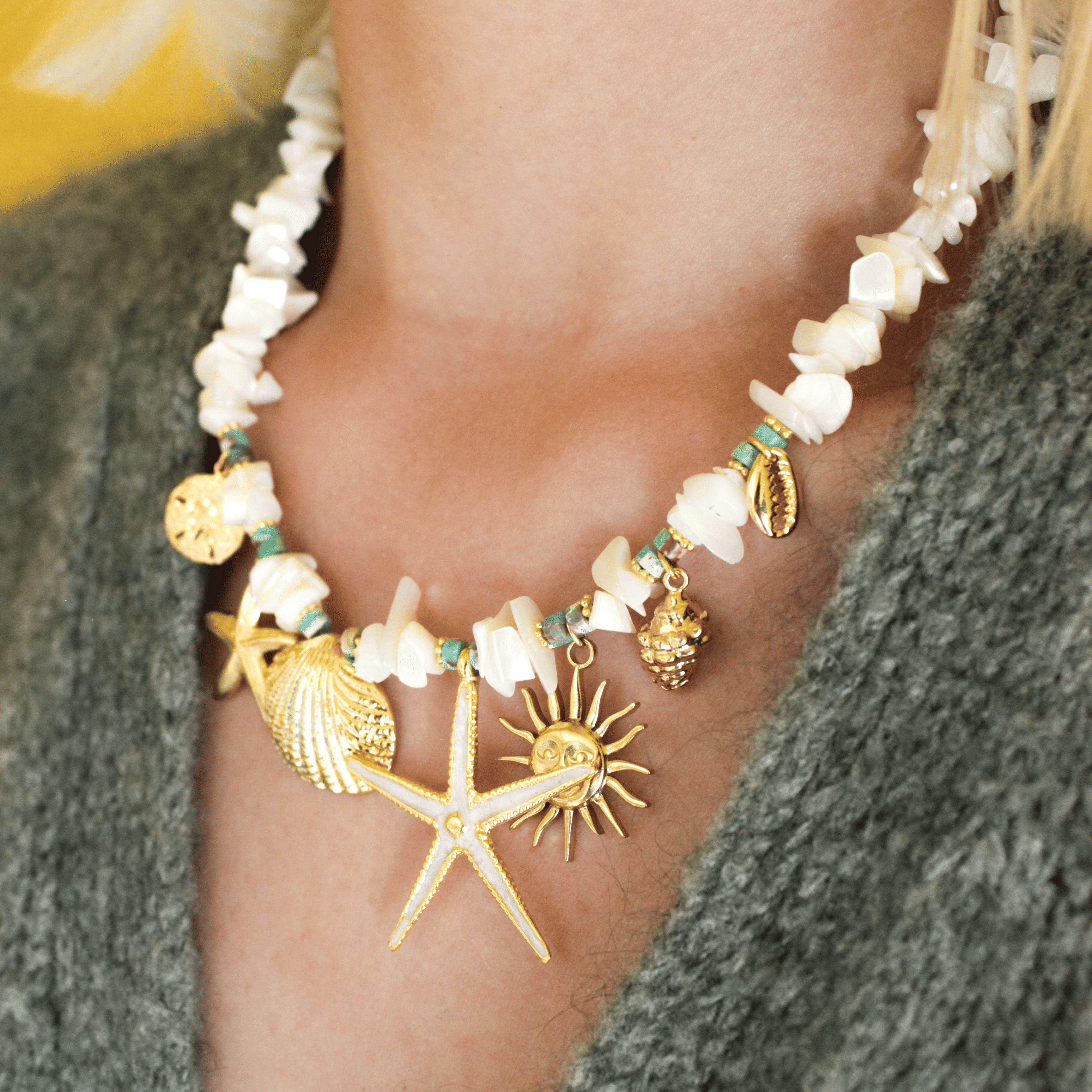 Ce collier associe perles crunchs et petits grigris en Nacre et Jaspe impériale. Ses teintes naturelles et lumineuses apportent élégance et originalité à vos tenues. À porter seul pour un style raffiné ou en accumulation pour un look bohème chic.