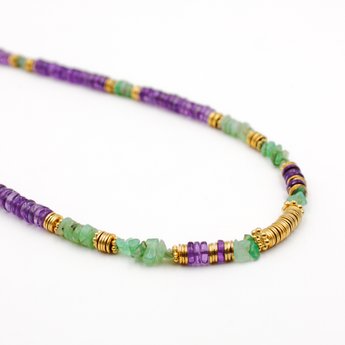 Découvrez l'élégance et la sérénité du collier heishi, un bijou délicat orné de pierres naturelles : Améthyste et Chrysoprase, qui apportent équilibre et harmonie à votre style.