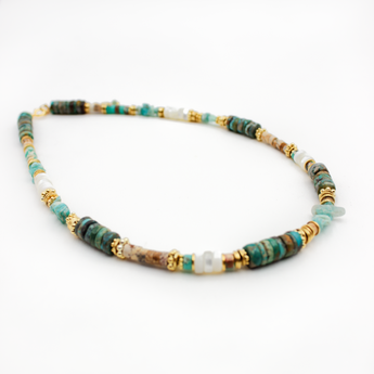 Ce collier associe perles heishi et pierres naturelles : Jaspe aquaterra, Nacre, Amazonite, Jaspe et Jaspe impériale. Ses couleurs douces et variées apportent élégance et originalité à vos tenues. À porter seul pour un style raffiné ou en accumulation pour un look bohème chic.