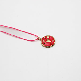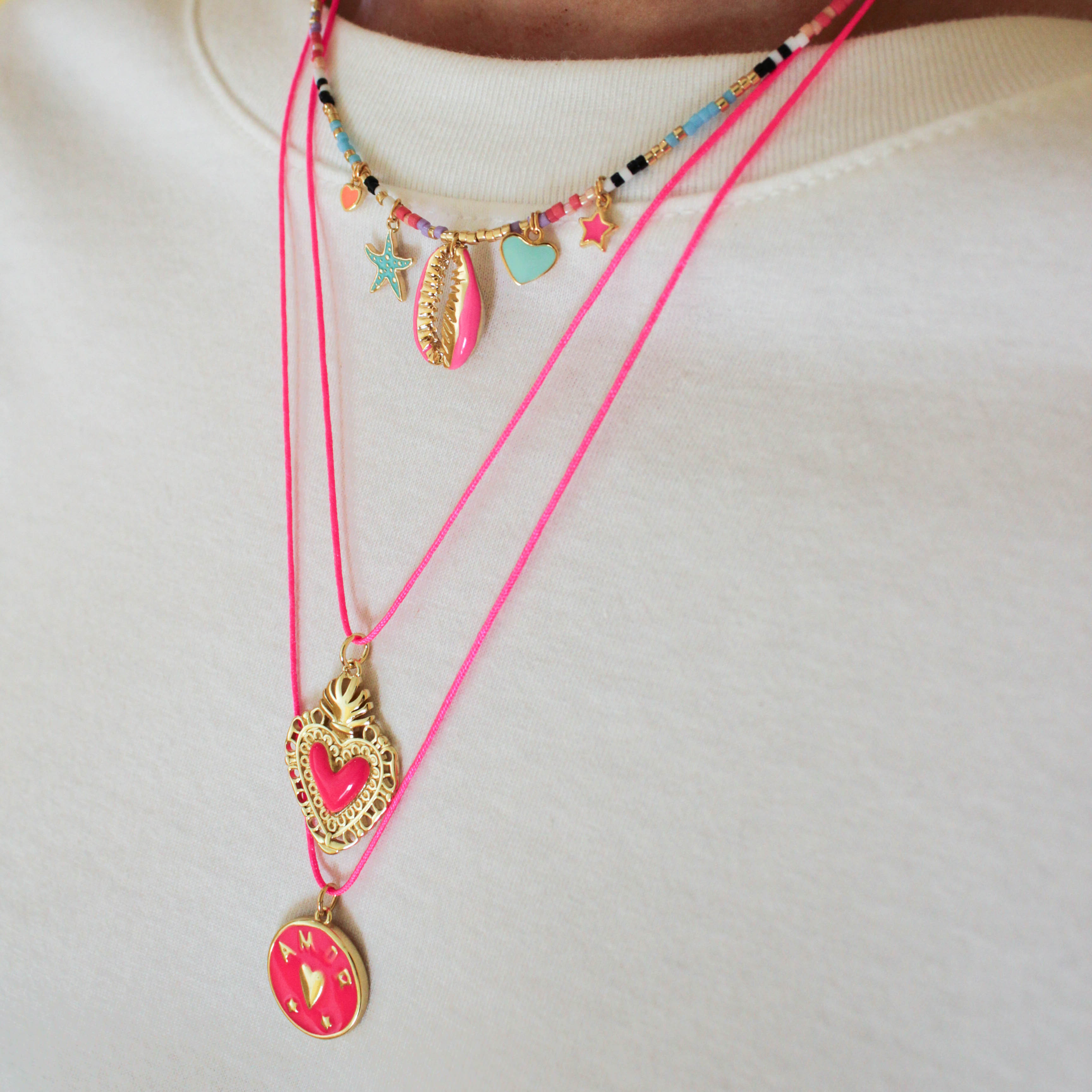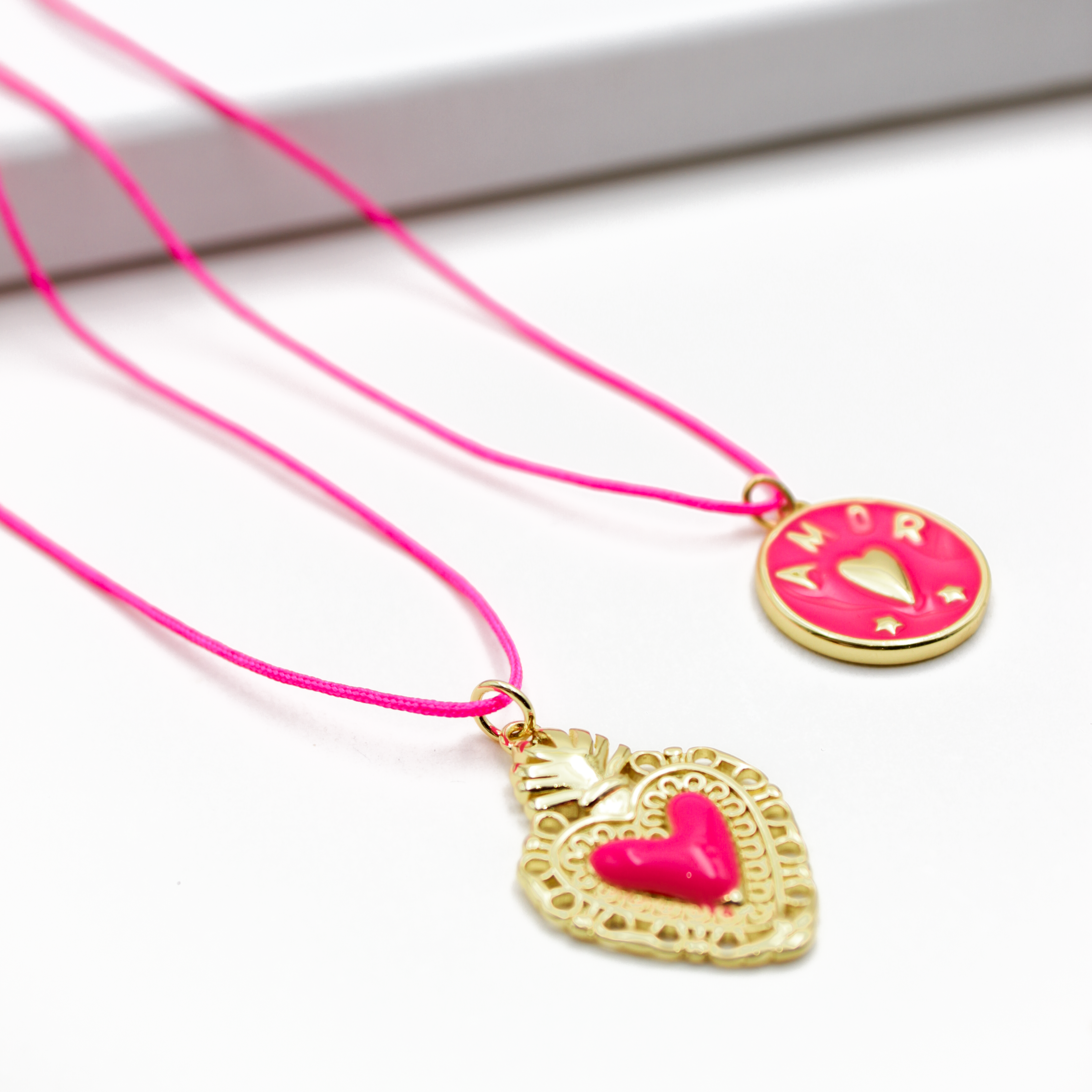Collier en cordon rose fluo, orné d’une médaille "amor". Sa couleur vive et son pendentif délicat apporte une touche moderne et pleine de charme à vos tenues. À porter seul ou en superposition pour un look pétillant et original.
