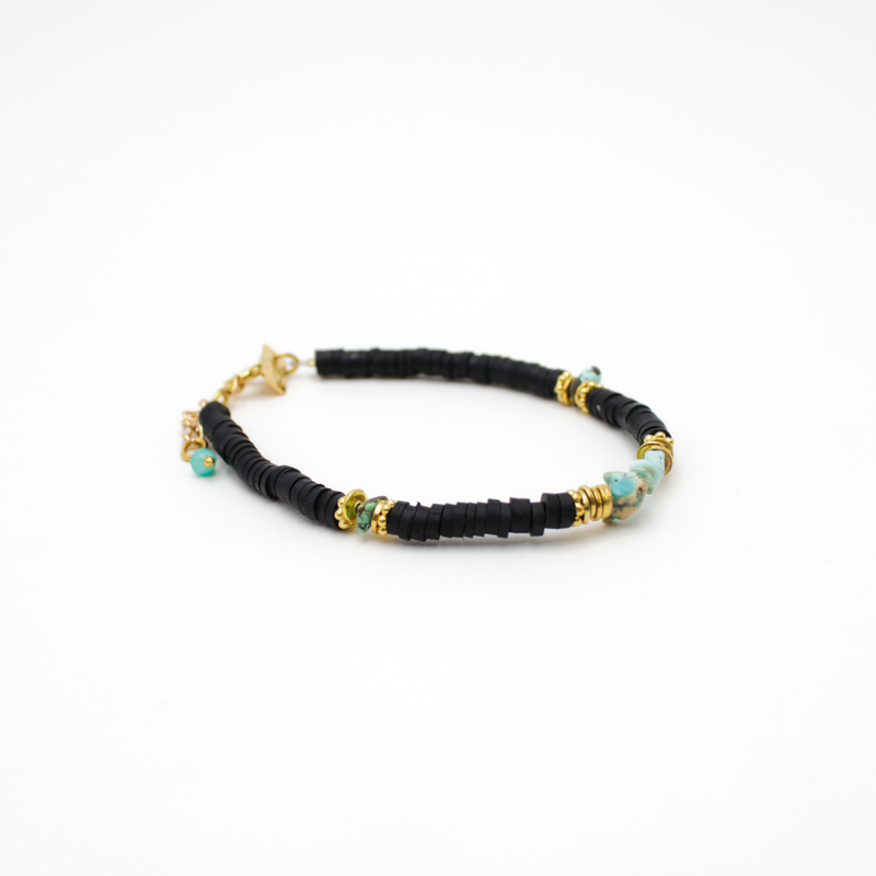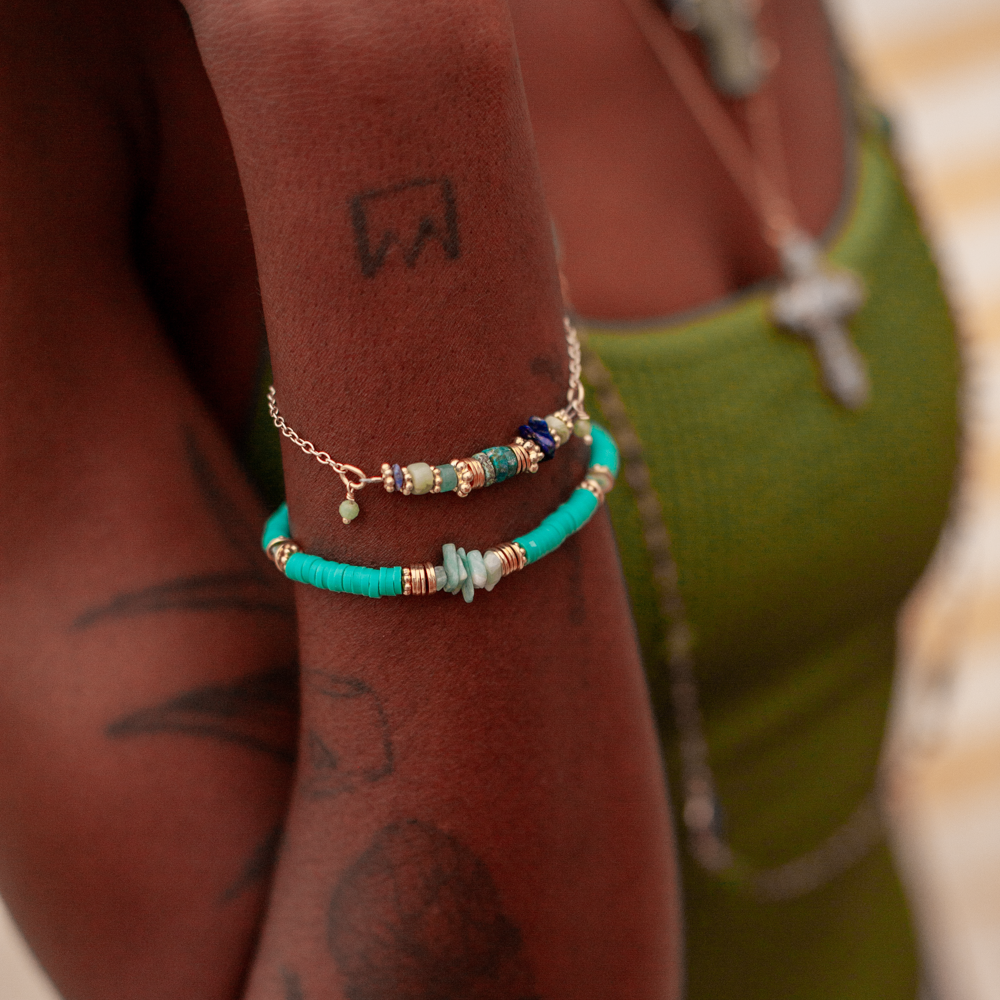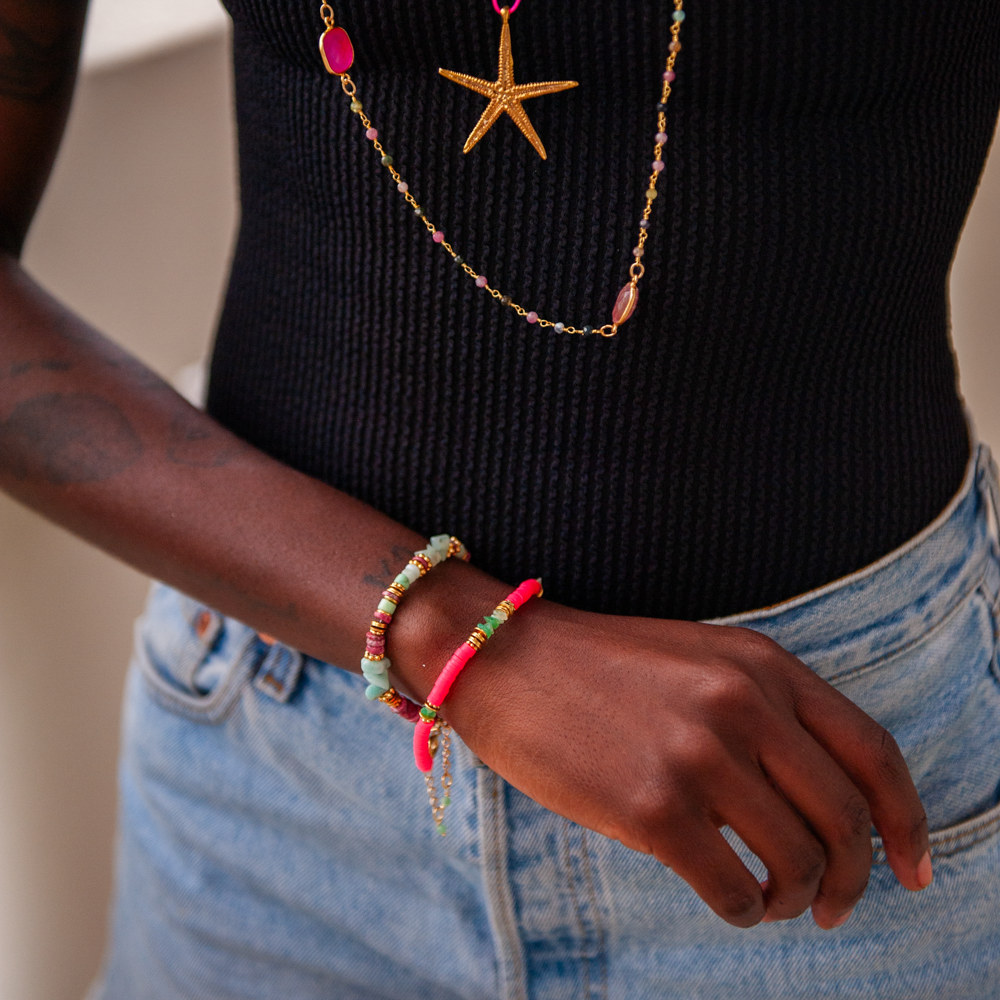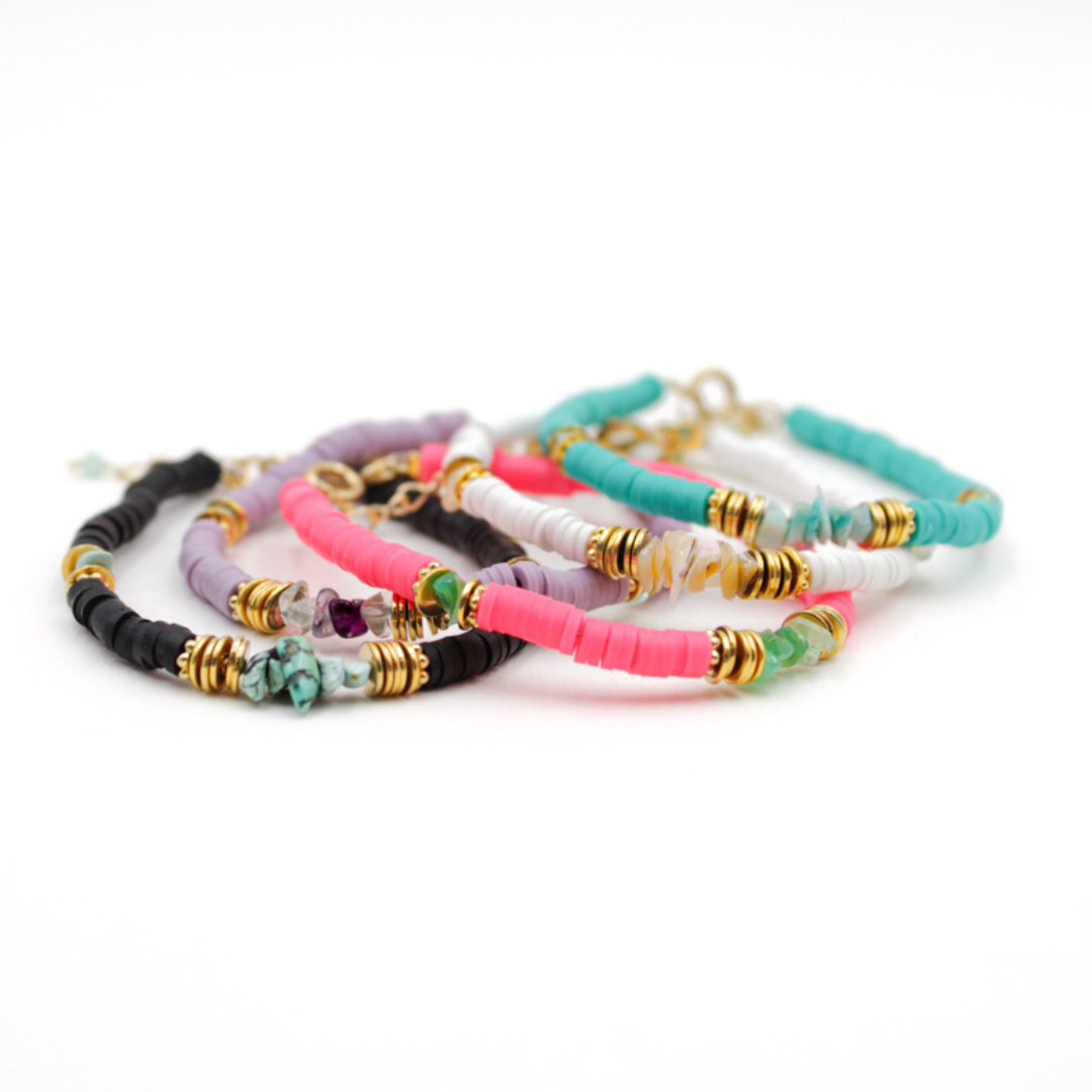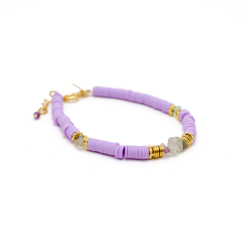 Découvrez notre bracelet gomme surfeuse, agrémenté de pierres fines et disponible en 5 coloris : lila, rose, turquoise, blanc et noir. Chaque bracelet incarne l'esprit libre et aventurier de la surfeuse, combinant des nuances inspirantes avec des pierres naturelles.