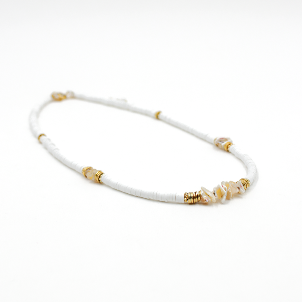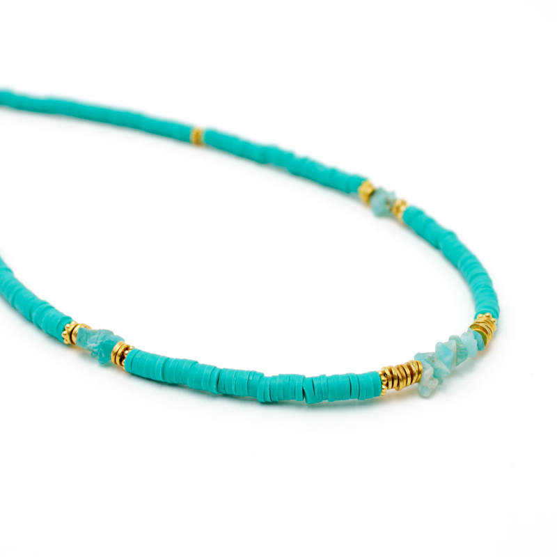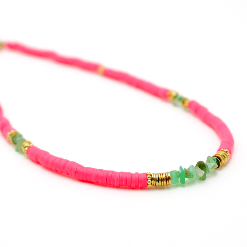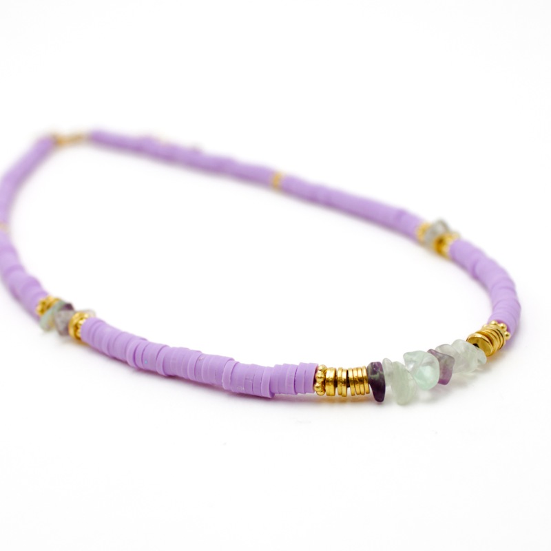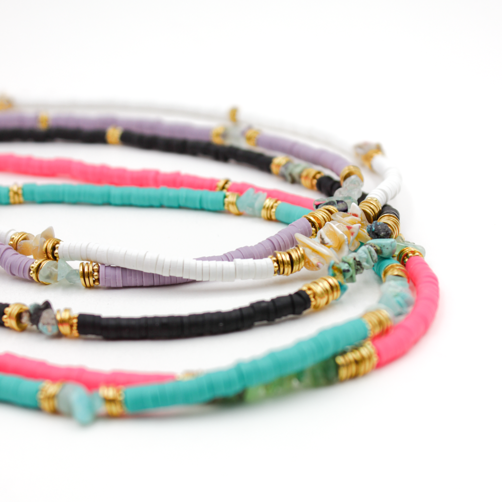 Découvrez notre collier gomme surfeuse, agrémenté de pierres fines et disponible en 5 coloris : lila, rose, turquoise, blanc et noir. Chaque collier incarne l'esprit libre et aventurier de la surfeuse, combinant des nuances inspirantes avec des pierres naturelles.