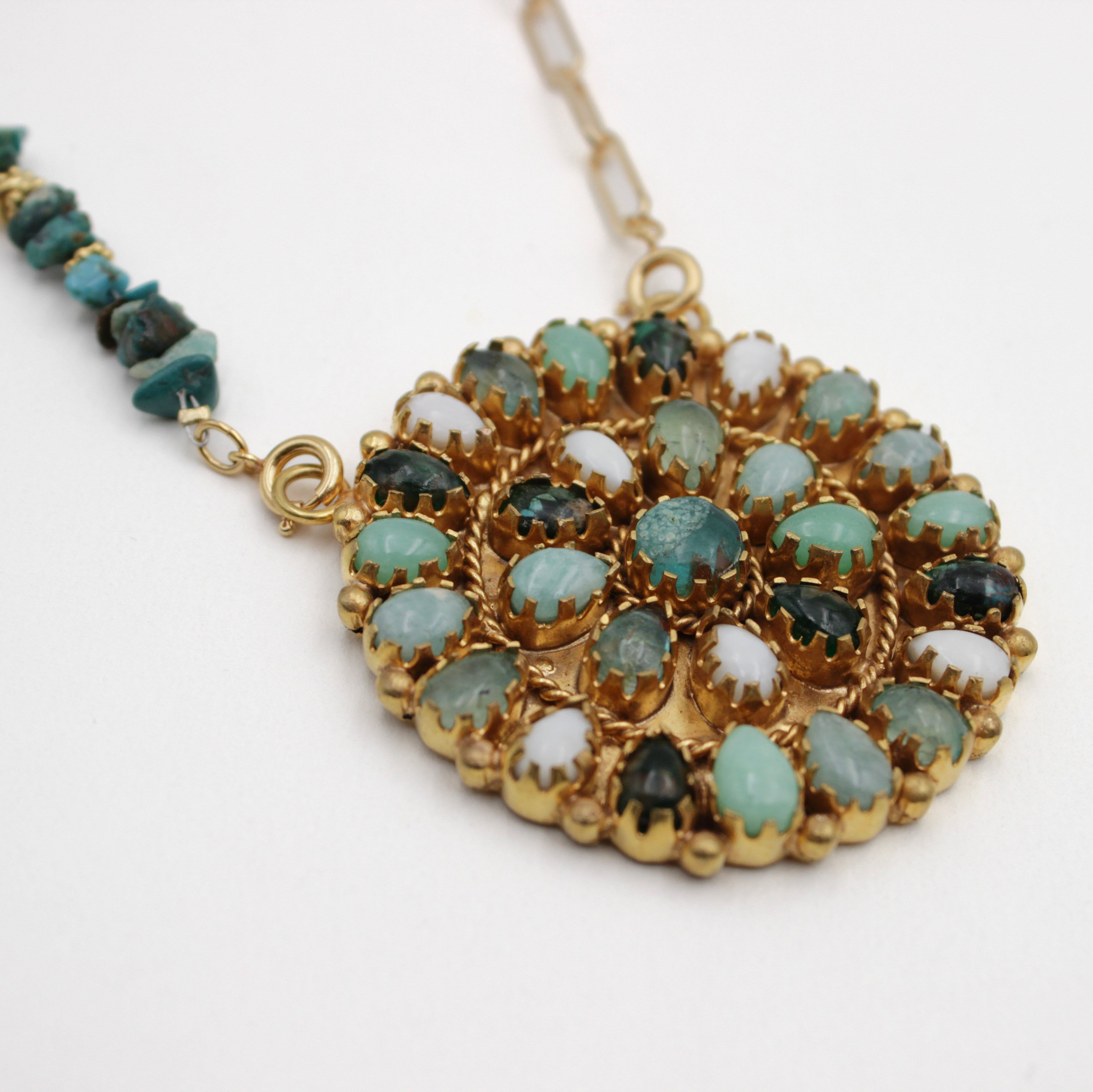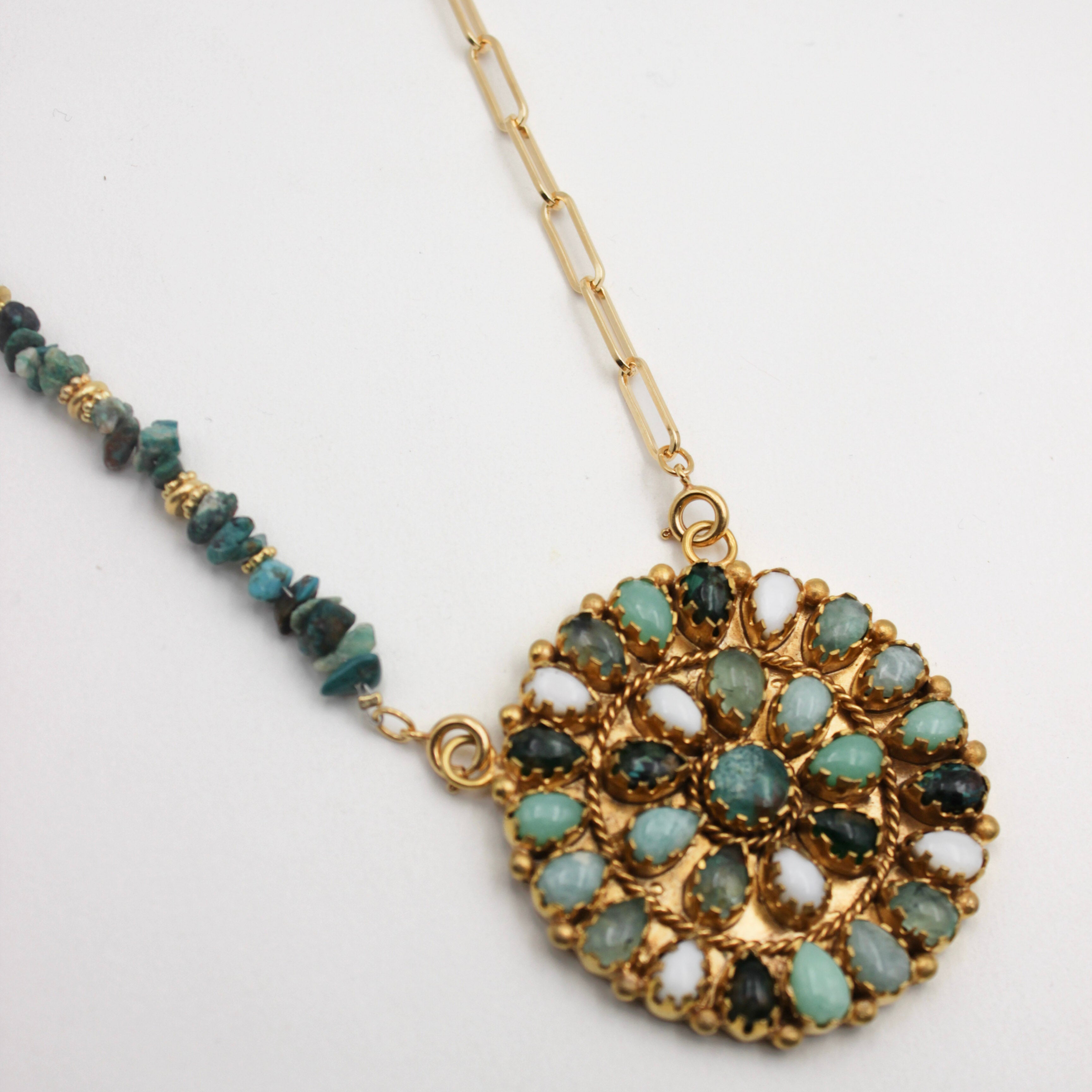 Laissez-vous illuminer par ce collier imaginé comme un jardin précieux : un pendentif rond délicatement sculpté en forme de fleur, entièrement orné de pierres naturelles véritables, choisies pour leurs nuances vibrantes de bleu, vert et blanc.