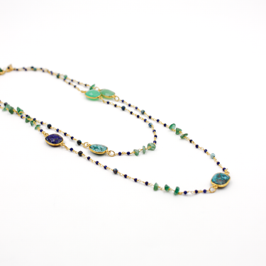 Les pièces de l'Atelier des Dames sont fabriquées avec des chaînages issus de maisons françaises et de pierres fines travaillées par des artisans. Elles se déclinent en collier simple, collier multirangs, sautoir, bracelet simple, bracelet multirangs, jonc, manchettes, boucles d'oreilles, créoles et bague. Un large choix de bijoux et de couleurs pour que chaque femme trouve son style !