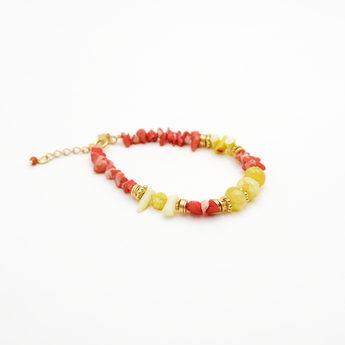 Ce bracelet allie perles heishi, crunchs et billes, ornés de Corail, Nacre jaune et Calcédoine jaune. Ses teintes chaudes et lumineuses apportent fraîcheur et élégance à votre poignet. À porter seul pour une touche subtile ou en accumulation pour un style bohème chic.
