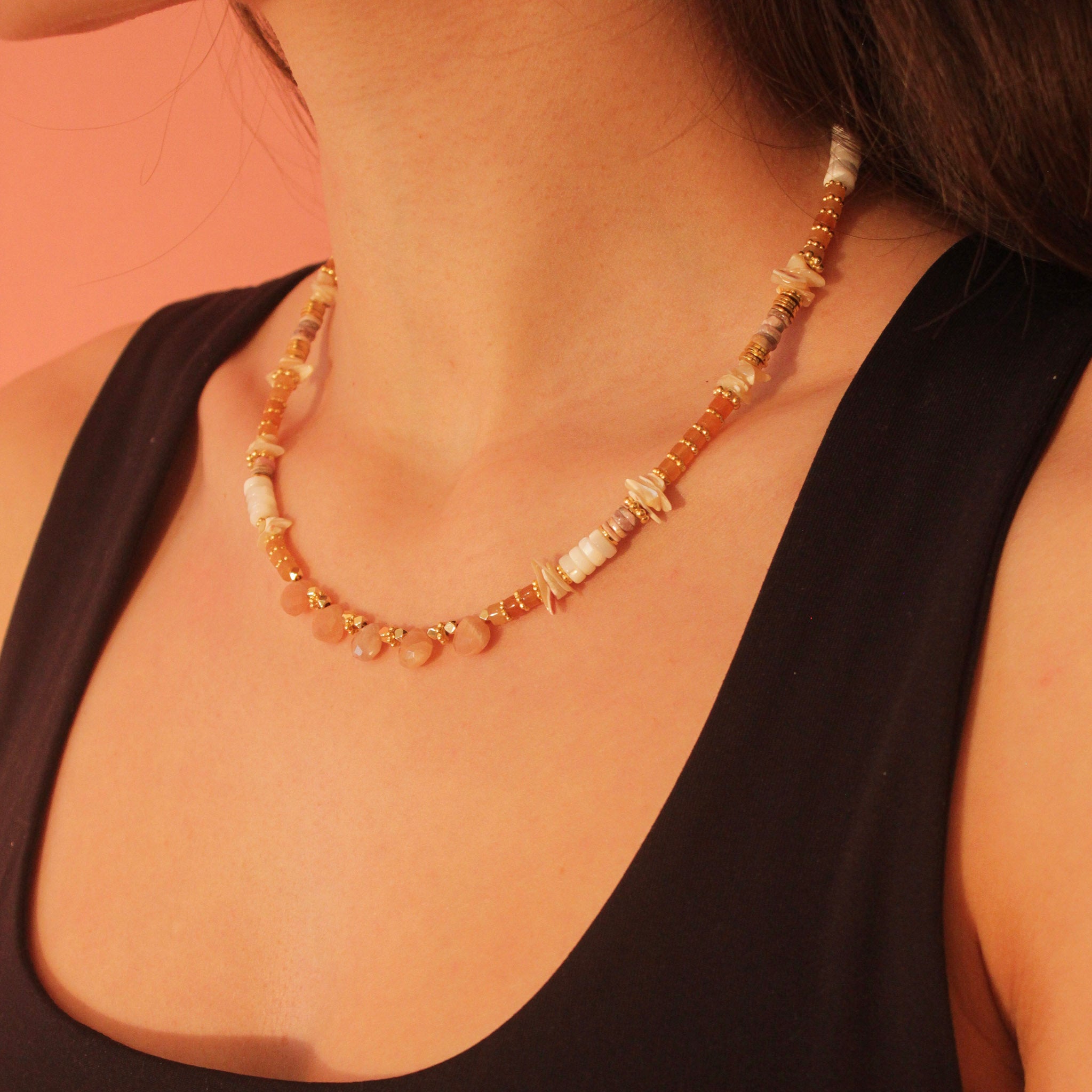 Ce collier se porte facilement et s’adapte à toutes vos envies. Les gouttes en pierres naturelles créent un effet lumineux et bohème, parfait pour illuminer vos tenues avec élégance au quotidien.
