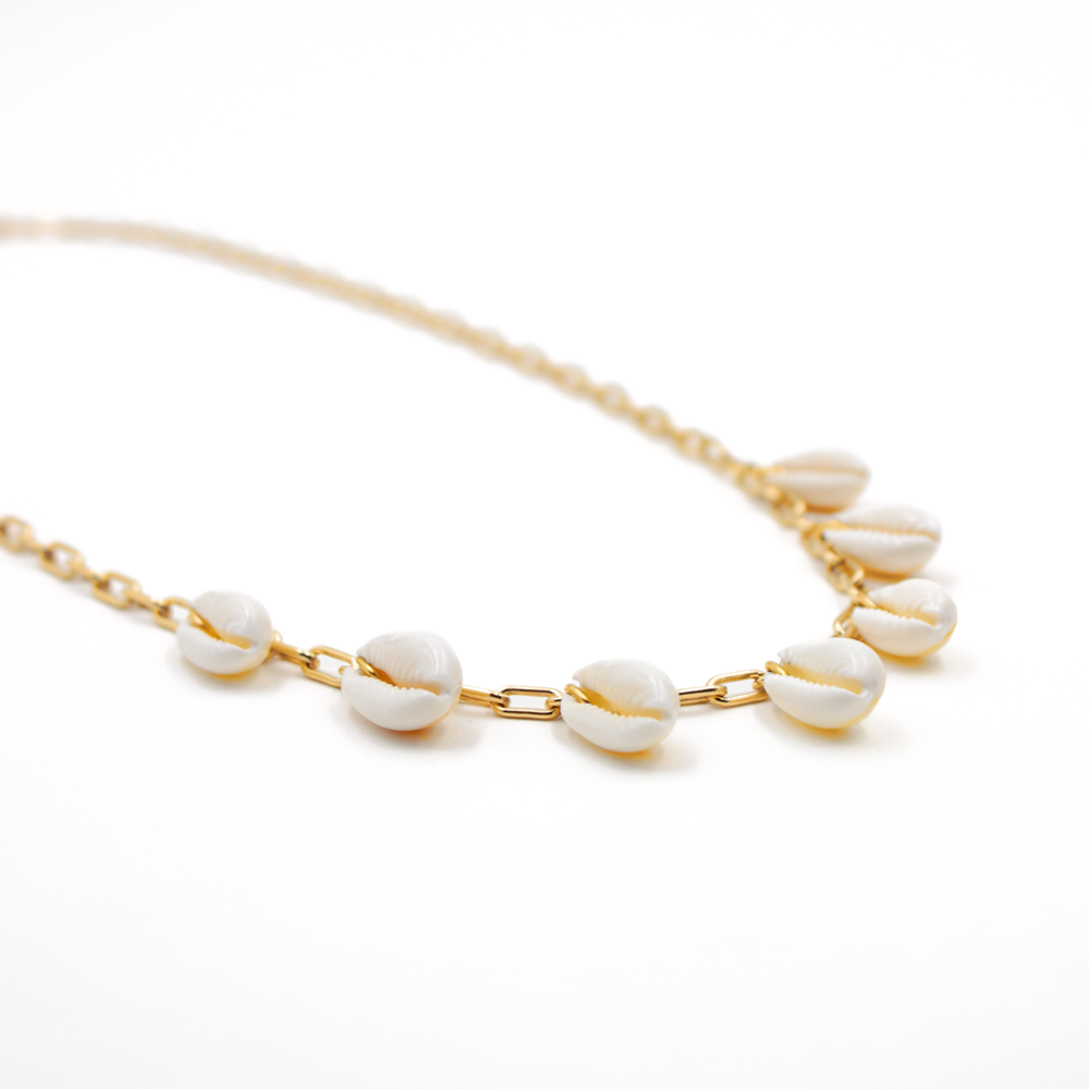 Avec ses pendentifs cauri, symbole de richesse et de prospérité, ce collier allie délicatement les mailles dorées à l'éclat naturel de la Nacre. Idéal pour rehausser un look décontracté ou plus habillé, il vous enveloppe de son énergie douce et positive.