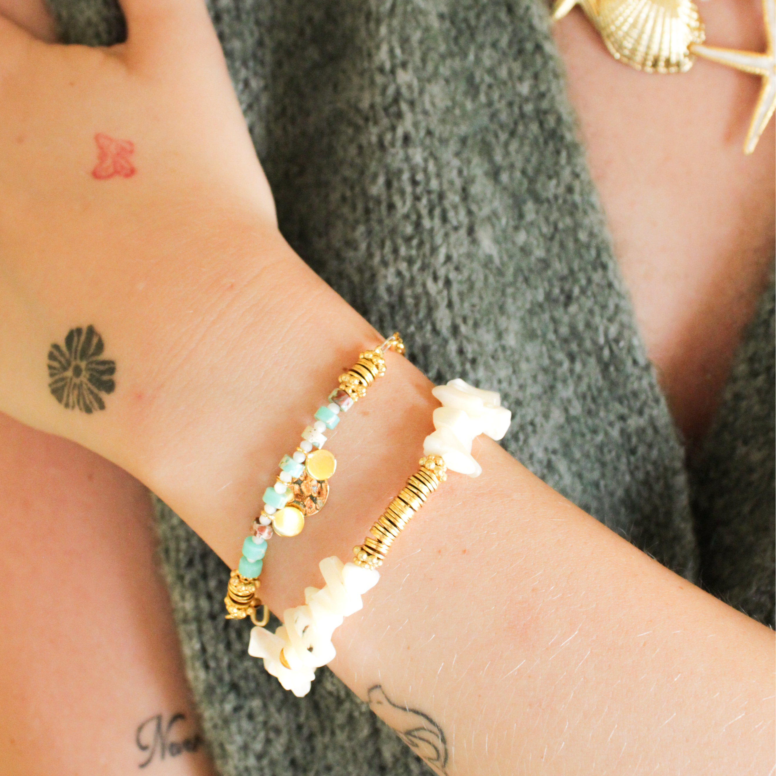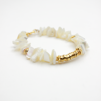 Ce bracelet est composé de perles crunchs en Nacre, apportant élégance et légèreté à votre poignet. Sa couleur douce et naturelle illumine vos tenues avec subtilité. À porter seul pour un style discret ou en accumulation pour un look bohème chic.