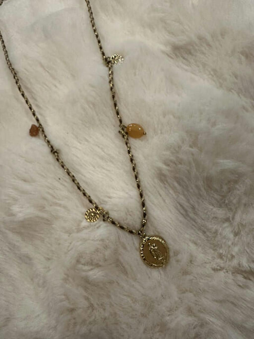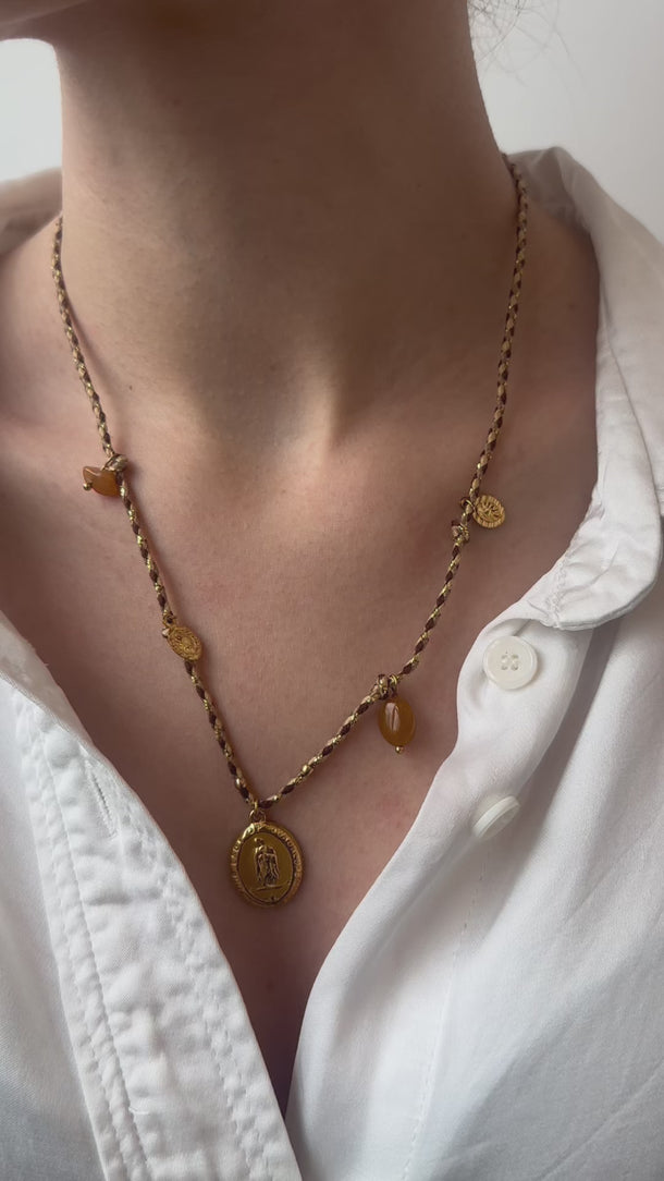 Un collier mystique et lumineux, orné de quatre médaillons ex voto dorés et d’un médaillon rouge central, symbole de passion, de foi et de protection. Chaque ex voto, inspiré des talismans anciens, incarne un vœu précieux, un espoir, une promesse faite au cœur.