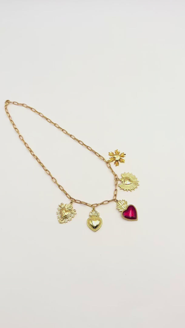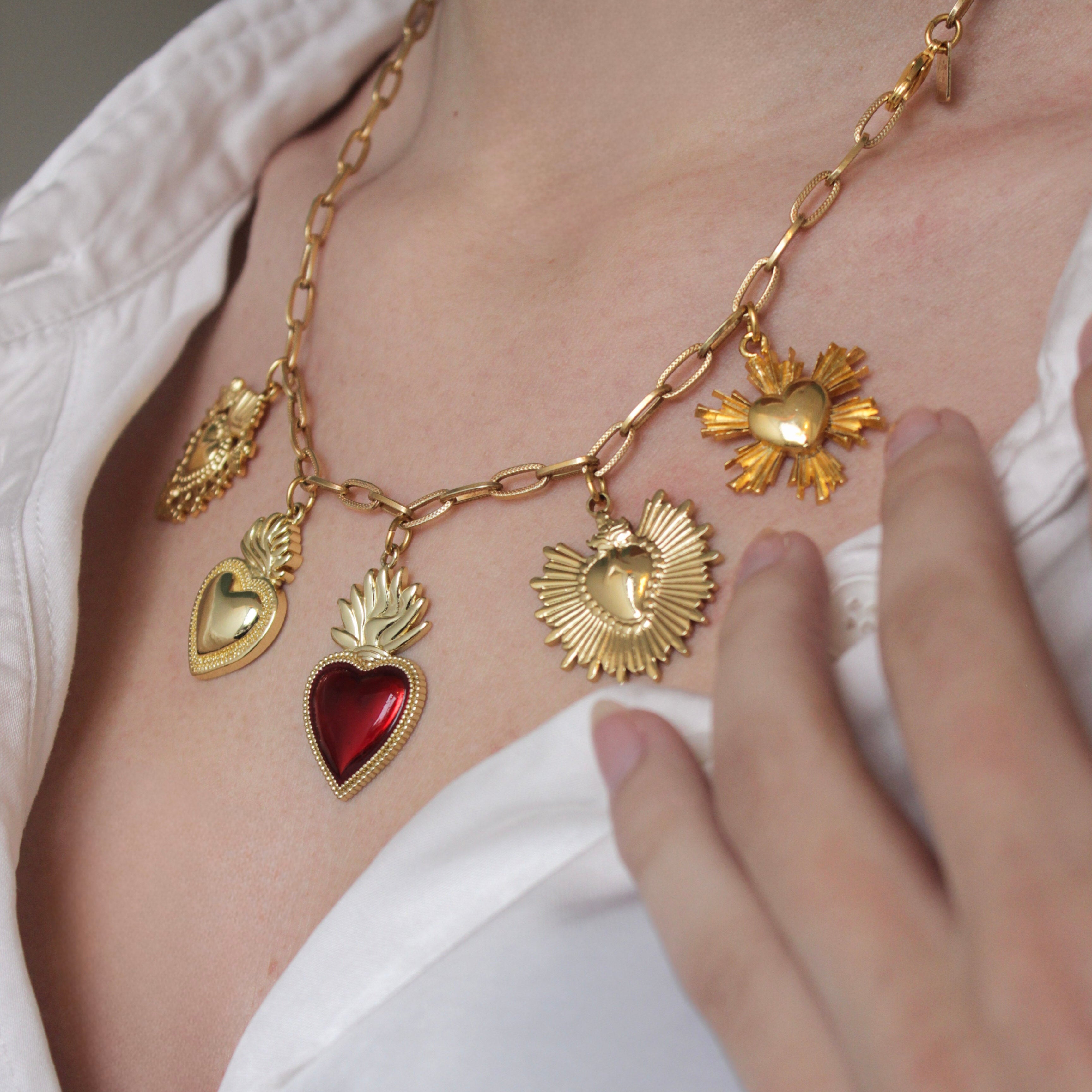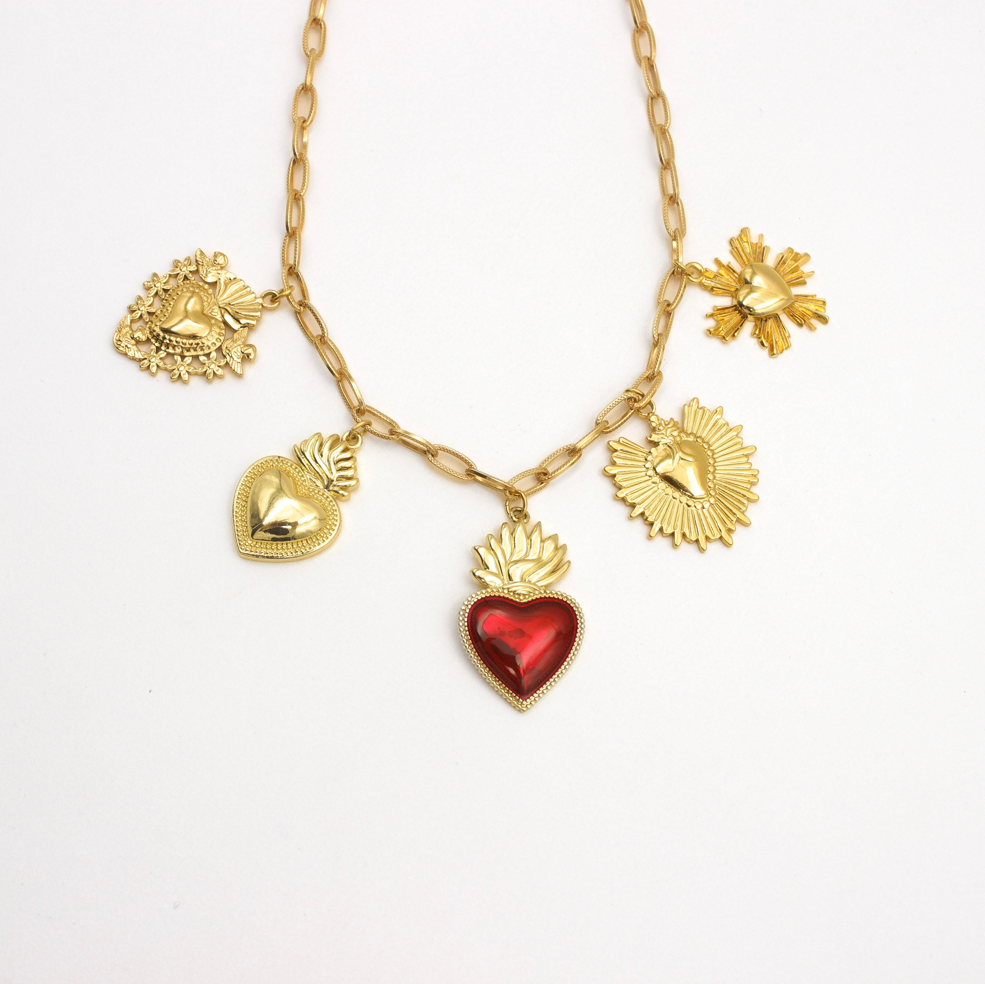 Un collier mystique et lumineux, orné de quatre médaillons ex voto dorés et d’un médaillon rouge central, symbole de passion, de foi et de protection. Chaque ex voto, inspiré des talismans anciens, incarne un vœu précieux, un espoir, une promesse faite au cœur.