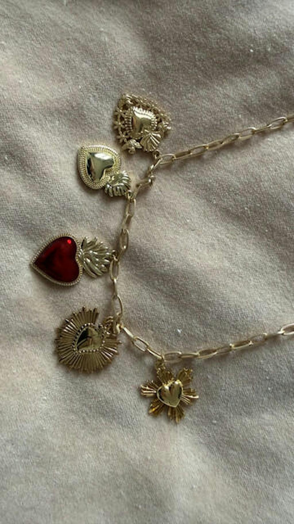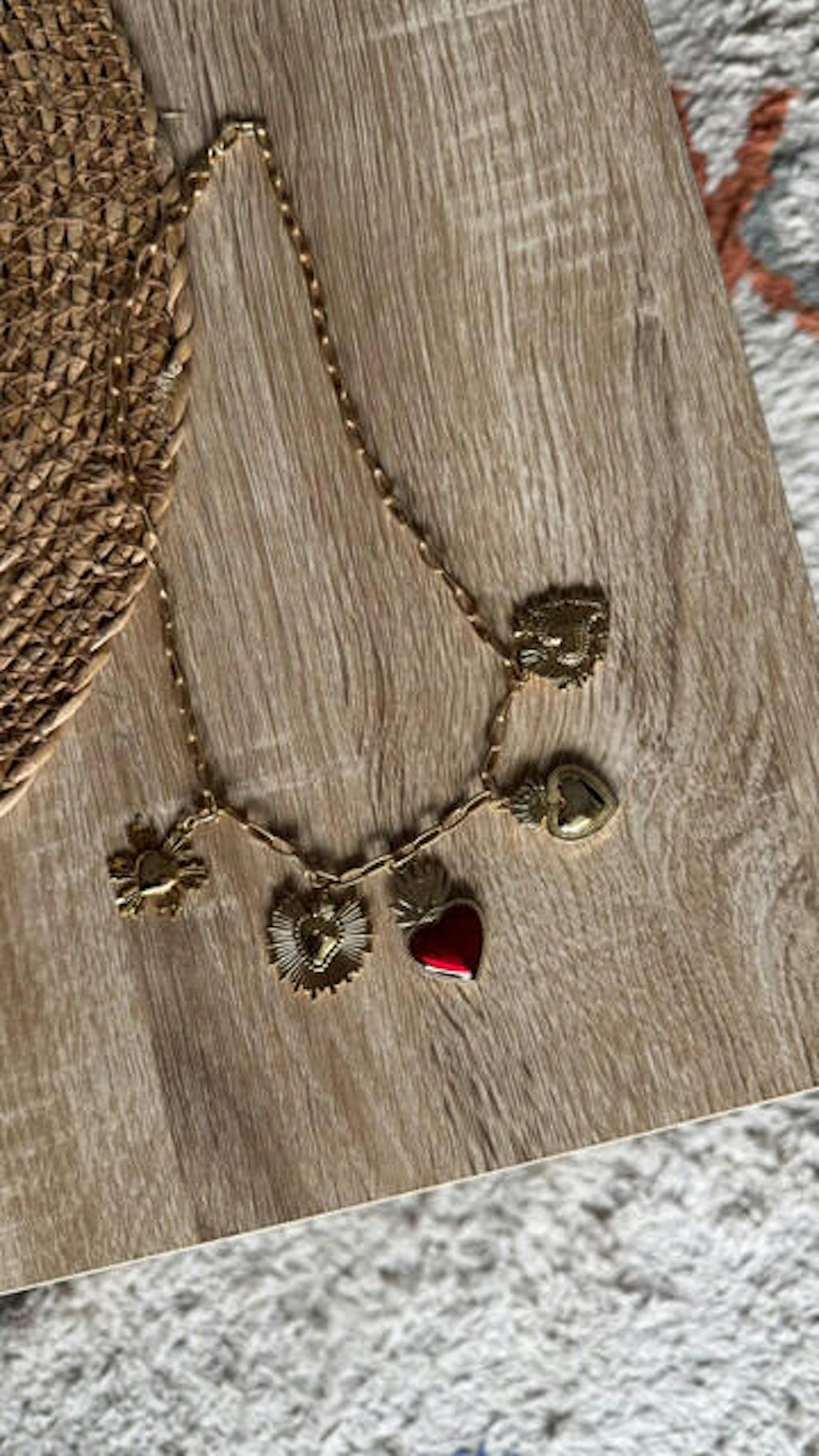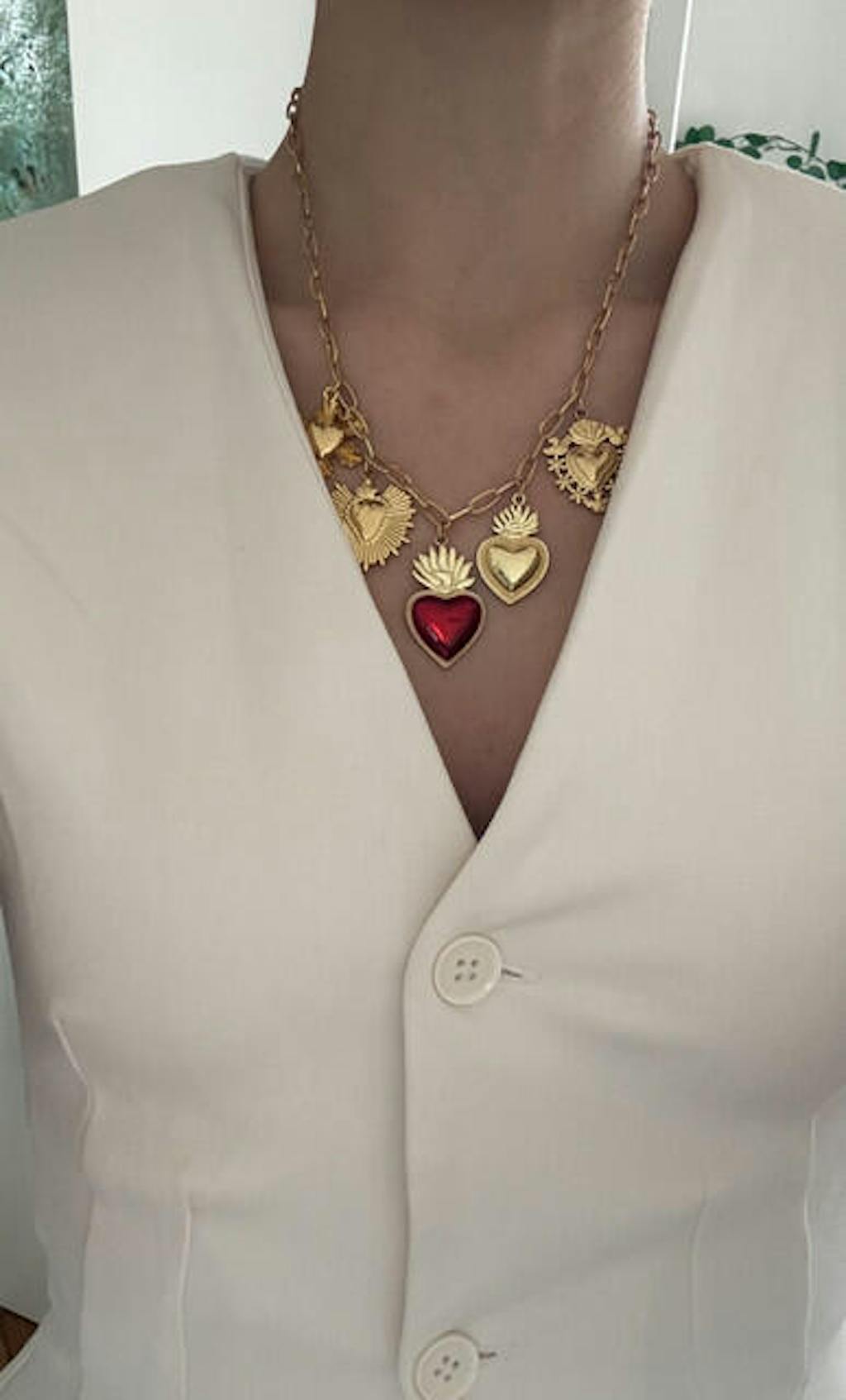 Un collier mystique et lumineux, orné de quatre médaillons ex voto dorés et d’un médaillon rouge central, symbole de passion, de foi et de protection. Chaque ex voto, inspiré des talismans anciens, incarne un vœu précieux, un espoir, une promesse faite au cœur.