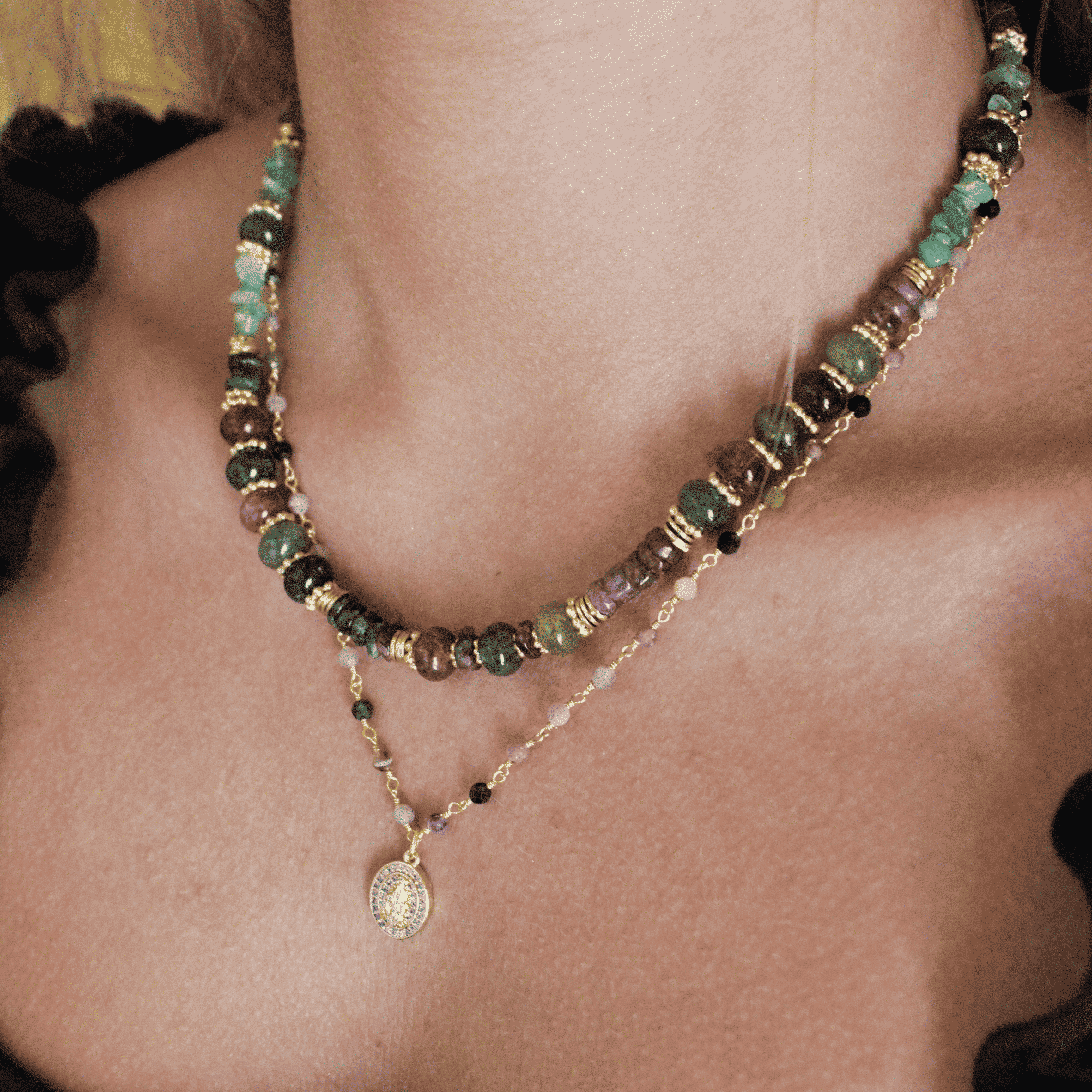 Ce collier est orné d’un pendentif vierge accompagné de Tourmaline, pierre aux nuances riches et naturelles. Alliant symbolisme et élégance, il apporte une touche spirituelle et raffinée à vos tenues. Un bijou intemporel à porter au quotidien ou lors d’occasions spéciales.